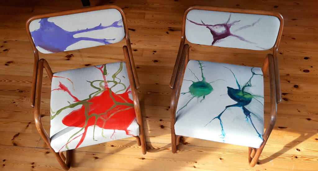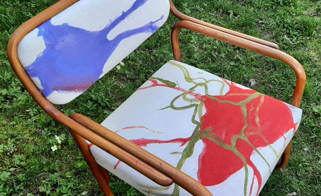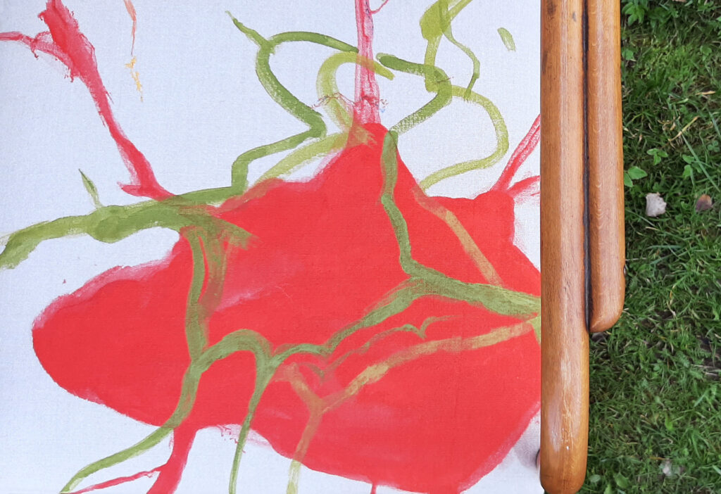 they are part of the series forms (of being), where i use details found in nature that are amplify and dipped into color. they are living beings to me, parts of rock, ice, snow, earth. this time, i painted on canvas that was mounted onto these chairs, with the help and gift of wonderful Luisa Wammes.